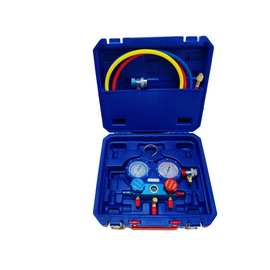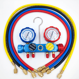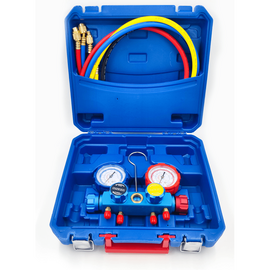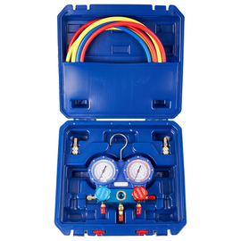 Манометрический 2 вентильный коллектор со шкалами фреонов: R22/32/134/410. Поставляется в комплекте с 3 заправочными шлангами 90 см, 1/4" SAE.