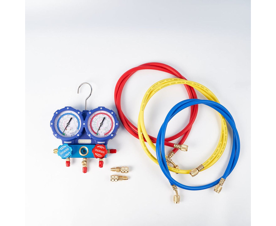 Для работы с фреонами: R22, R134, R404, R410. Диаметр манометров 80 мм.