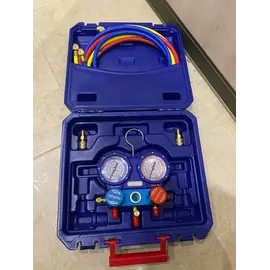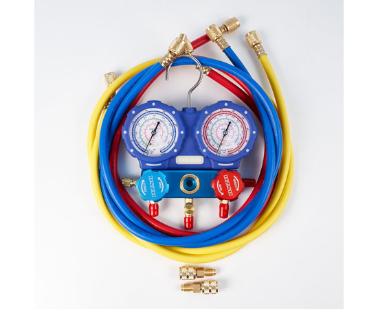 Поставляется в кейсе в комплекте с заправочными шлангами длиной 150 см 1/4" SAE (800 PSI) и двумя адаптерами R410 x R22.