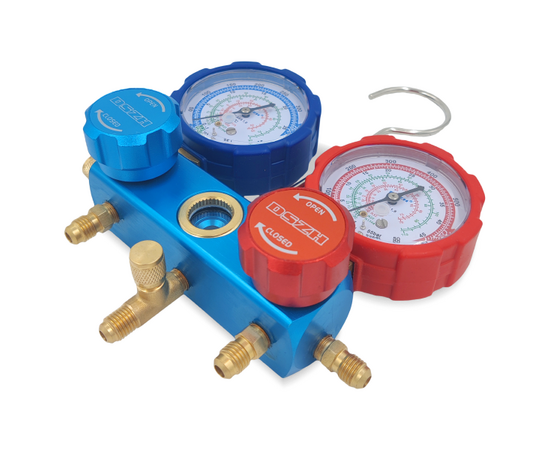 Для работы с фреонами: R22, R32, R134, R410. Диаметр манометров 68 мм. Алюминиевый корпус со смотровым стеклом. Без шлангов.