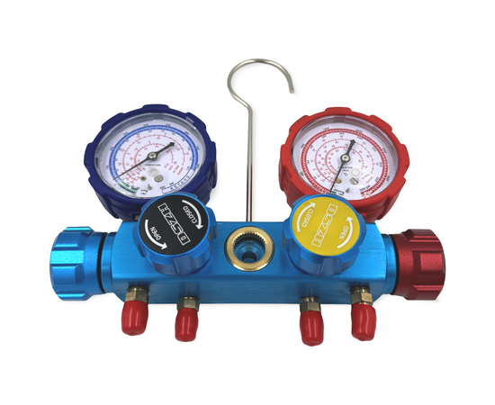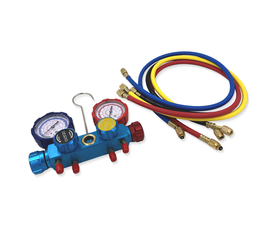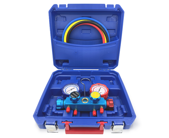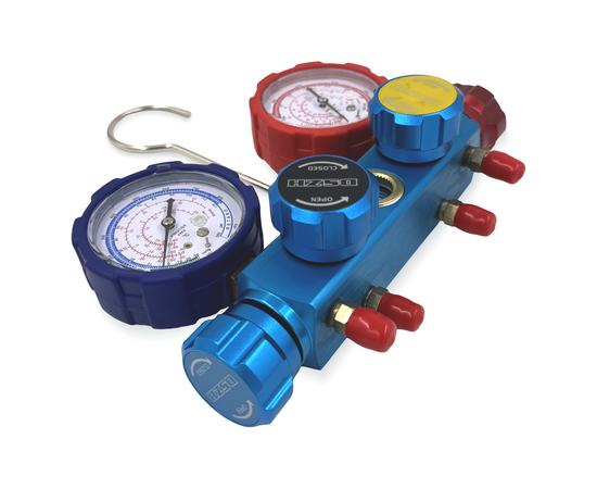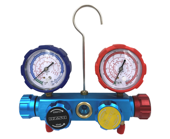 Манометрический 4-х вентильный коллектор DSZH CT-436G - инструмент для определения давления в холодильном контуре. Помогает определить: вакуум, температуру кипения фреона, давление разных фреонов. Универсален под все виды наиболее используемых фреонов.