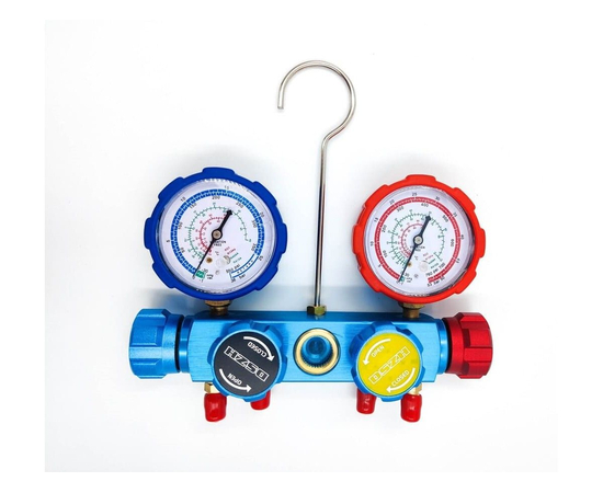 Манометрический 4 вентильный коллектор DSZH CT-836G-R410A с алюминиевым корпусом и смотровым стеклом, универсален под все виды наиболее используемых фреонов.