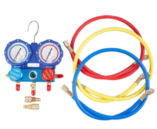Поставляется в кейсе в комплекте с заправочными шлангами длиной 150 см 1/4" SAE (800 PSI) и двумя адаптерами R410 x R22.
