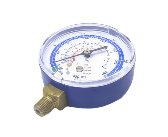 Корпус мановакуумметра DSZH WK-6808L изготовлен из окрашенной методом порошковой окраски в синий цвет стали. На шкалу мановакуумметра нанесены температурные шкалы R22, R134A, R404А, R410A, имеется юстировочный винт измерительного механизма.