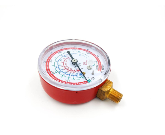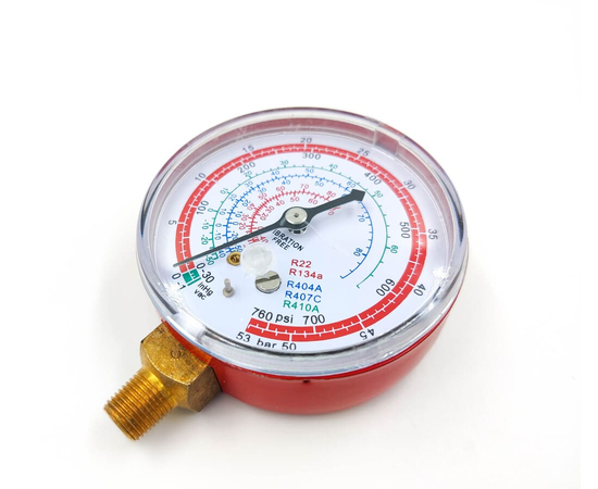 Корпус мановакуумметра изготовлен из окрашенной методом порошковой окраски в красный цвет стали. На шкалу нанесены температурные шкалы R22, R134A, R404А, R407, R410A.