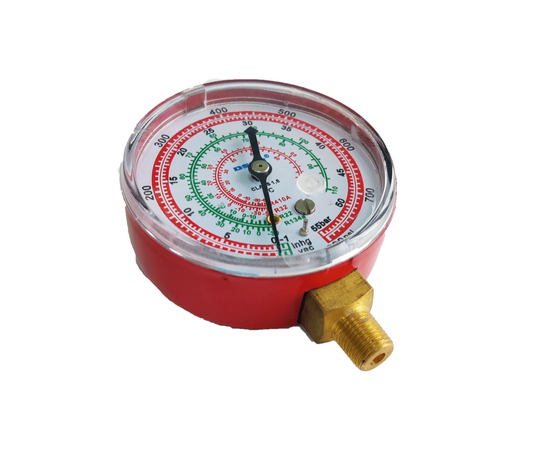 Корпус мановакуумметра изготовлен из окрашенной методом порошковой окраски в красный цвет стали. На шкалу нанесены температурные шкалы R22, R134A, R32, R410A.