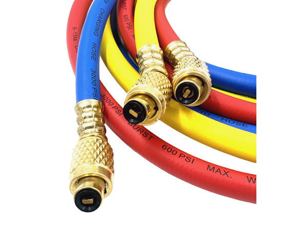 Комплект состоящий из 3-х заправочных шлангов по 0.9 м для заправки и вакуумирования кондиционеров. Шланги подсоединяются к вакуумным насосам, баллонам, манометрическим коллекторам. Для работы с фреонами R-12, R22, R134, R404A, R407C, R410A, R507, R600.