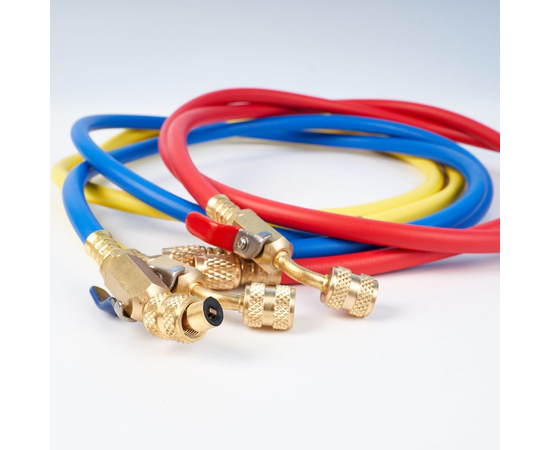Комплект состоящий из 3-х заправочных шлангов с вентилями по 0.9 м для заправки и вакуумирования кондиционеров.
