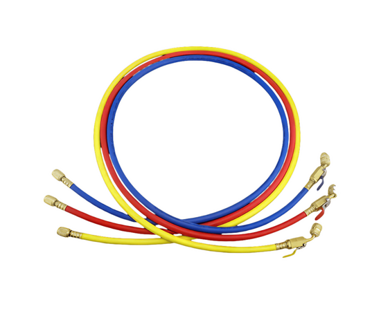 Комплект состоящий из 3-х заправочных шлангов DSZH CT-360-RYB-HV 1.5м с вентилями для заправки и вакуумирования кондиционеров. Шланги подсоединяются к вакуумным насосам, баллонам, манометрическим коллекторам.
