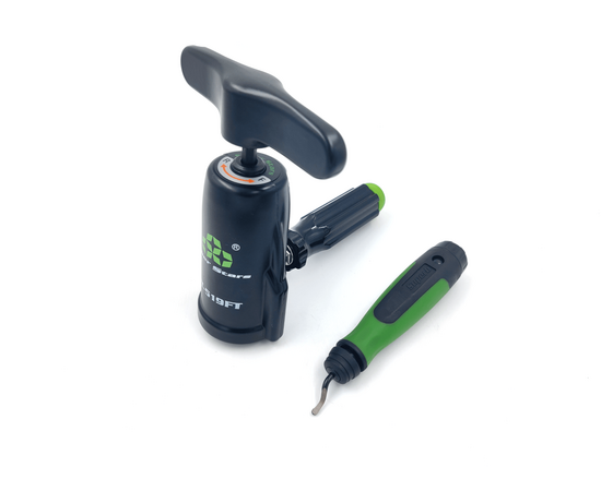 В комплекте 5 насадок для труб разных диаметров, ребристая ручка-держатель, риммер-карандаш, кейс.