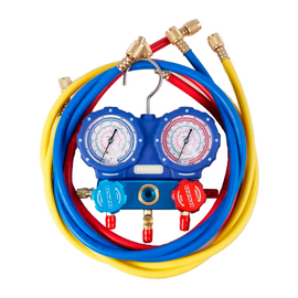 Манометрический 2 вентильный коллектор со шкалами фреонов: R22/32/134/410. Поставляется в кейсе в комплекте с 3 заправочными шлангами 1.5м, до 50 бар 1/4" SAE (800 PSI) и двумя адаптерами R410 x R22.